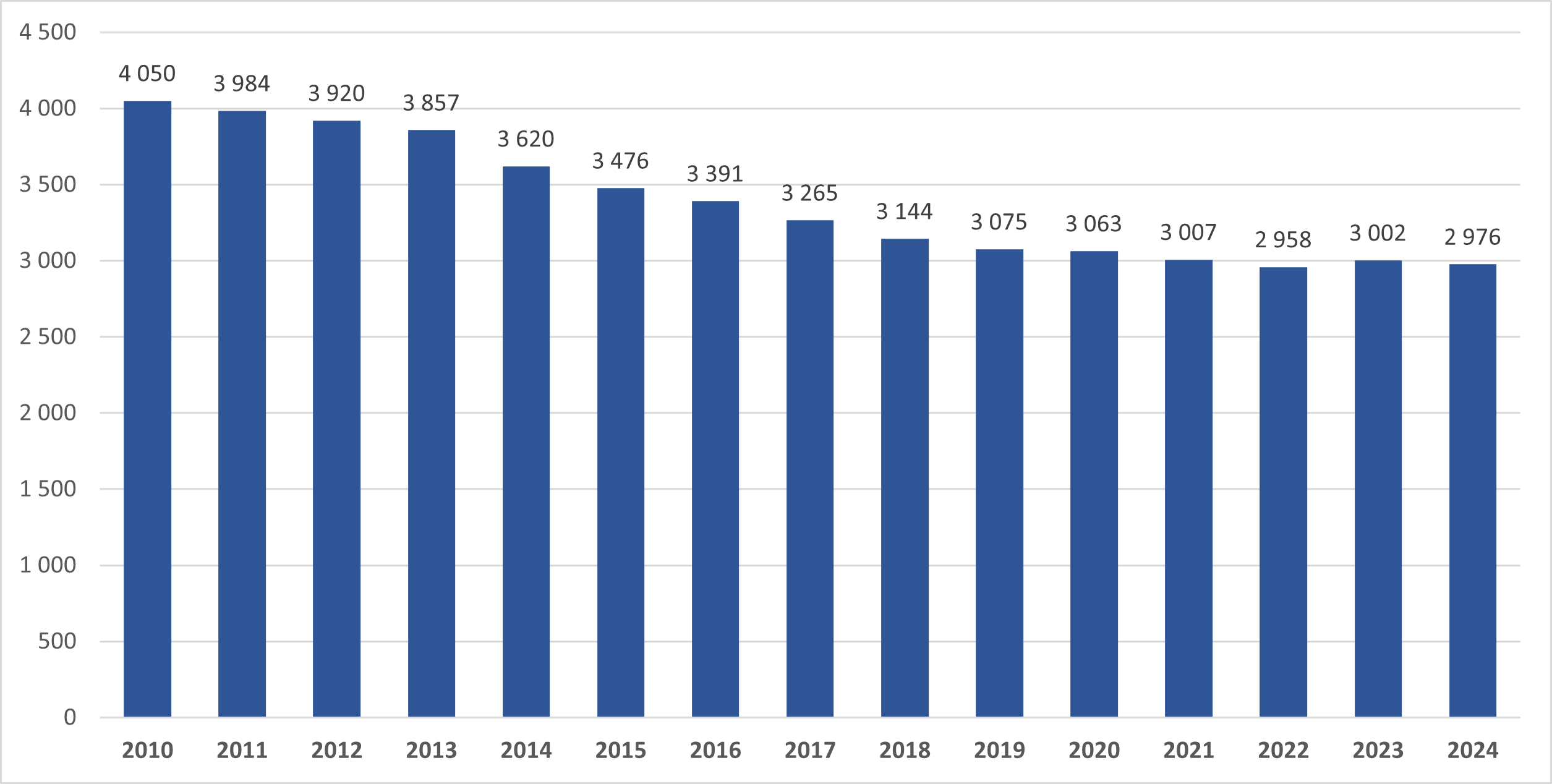 Revisorskårens storlek har minskat de flesta år under de senaste två decennierna. Sedan år 2020 har minskningstakten avtagit och planat ut.