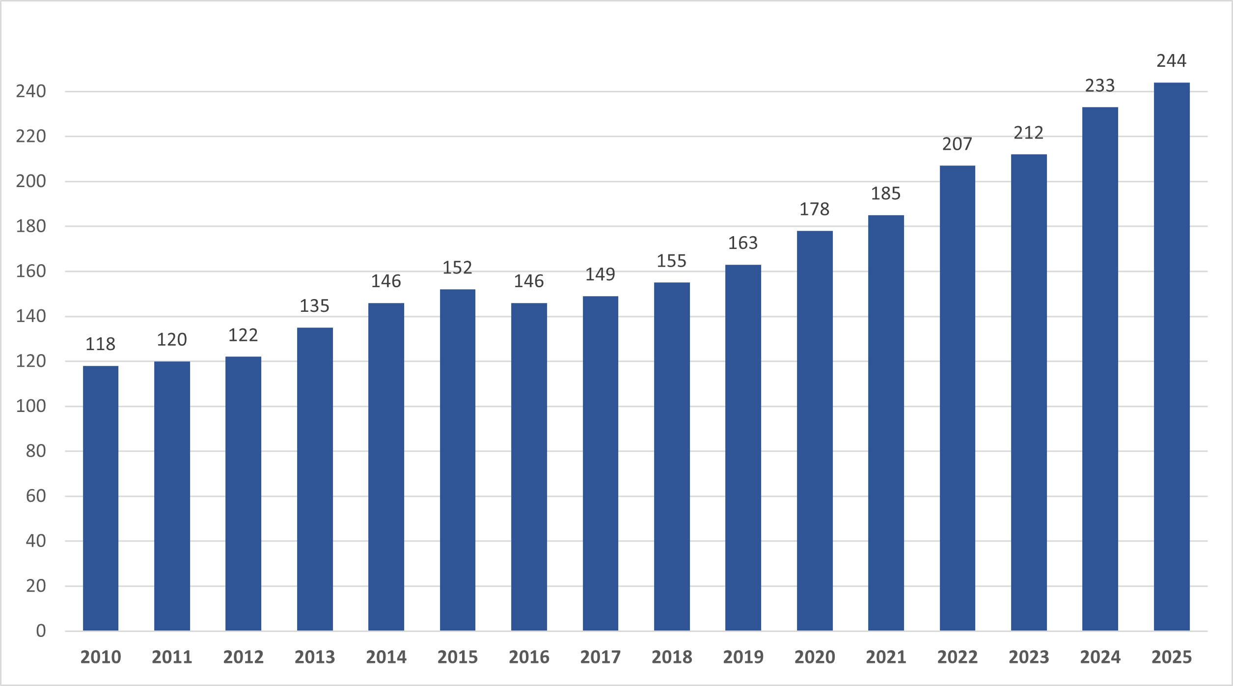 Antalet registrerade revisionsbolag fortsätter att öka. Den 2 januari 2025 fanns det 244 bolag i Revisorsinspektionens register, varav 236 registrerade revisionsbolag och åtta revisionsföretag från tredjeland.