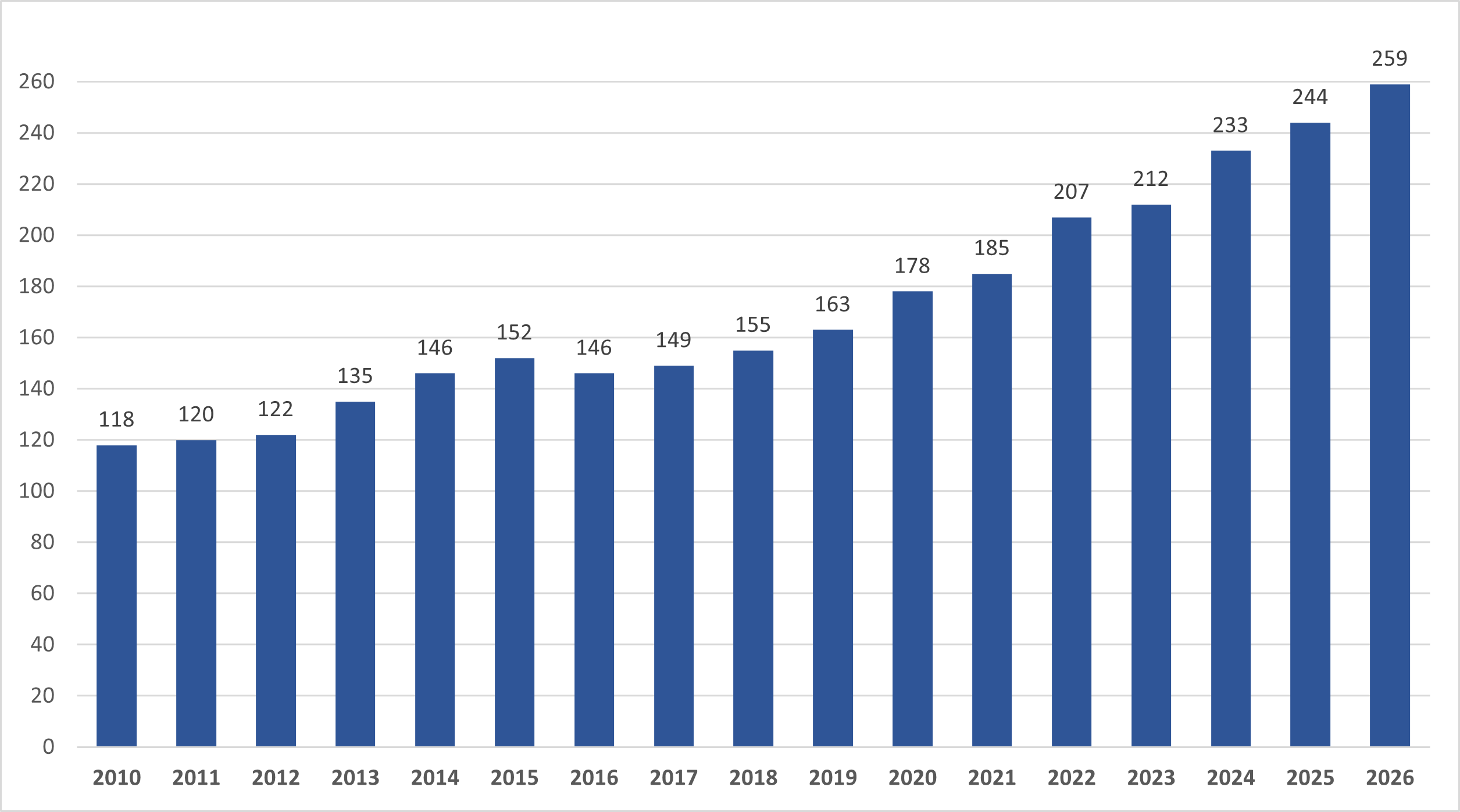 Antalet registrerade revisionsbolag fortsätter att öka. Den 1 januari 2026 fanns det 259 bolag i Revisorsinspektionens register, varav 249 registrerade revisionsbolag och tio revisionsföretag från tredjeland.